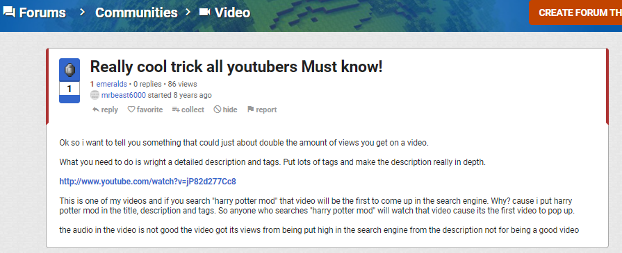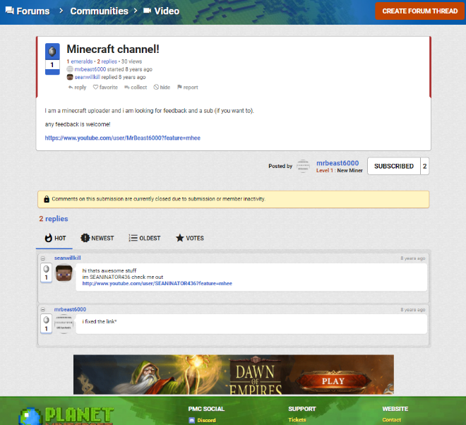 3 – Leverage Online Communities. MrBeast participated in at least a couple of Minecraft forums, and there are threads where you can see him trying to promote his channel and beg for subs.